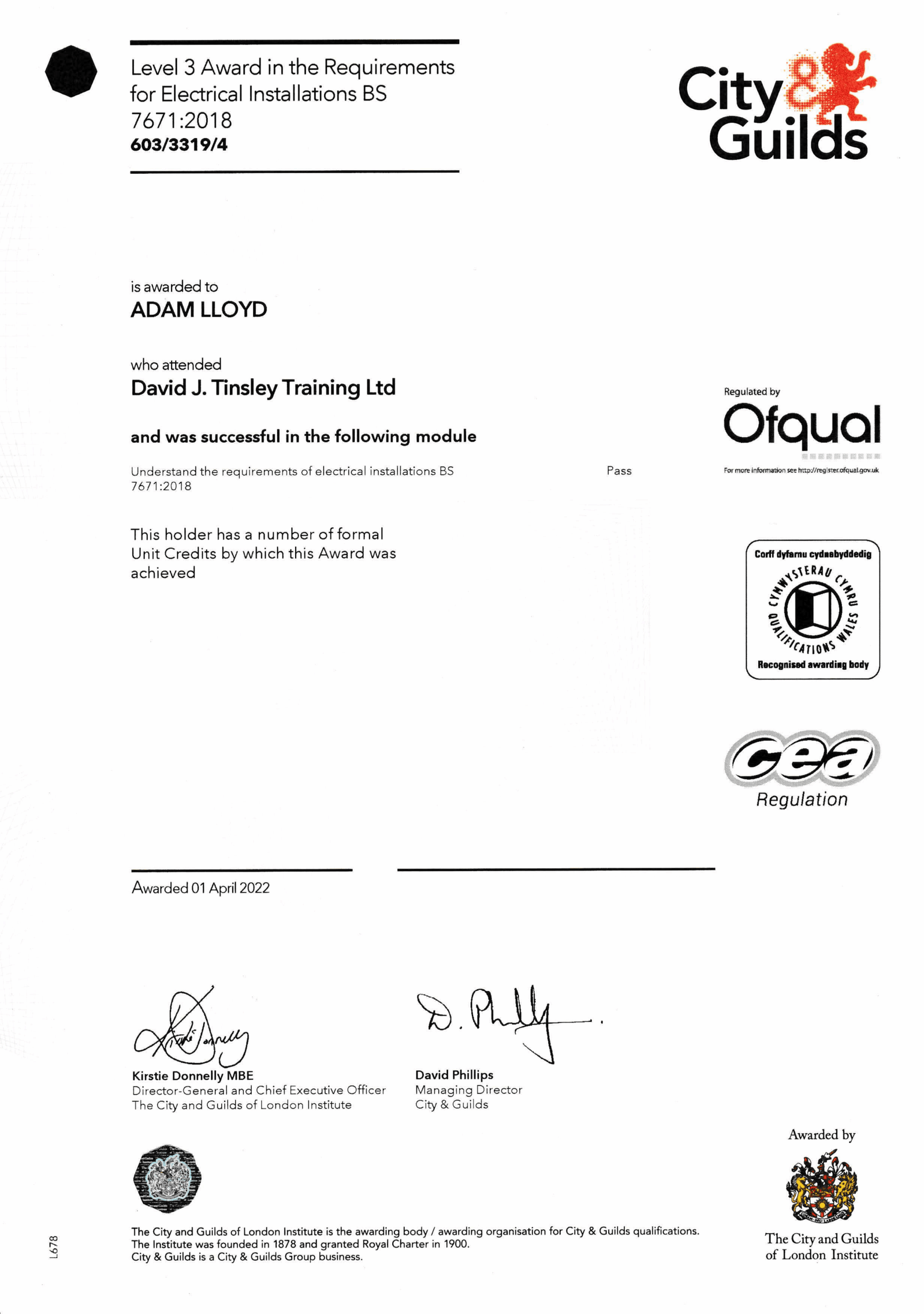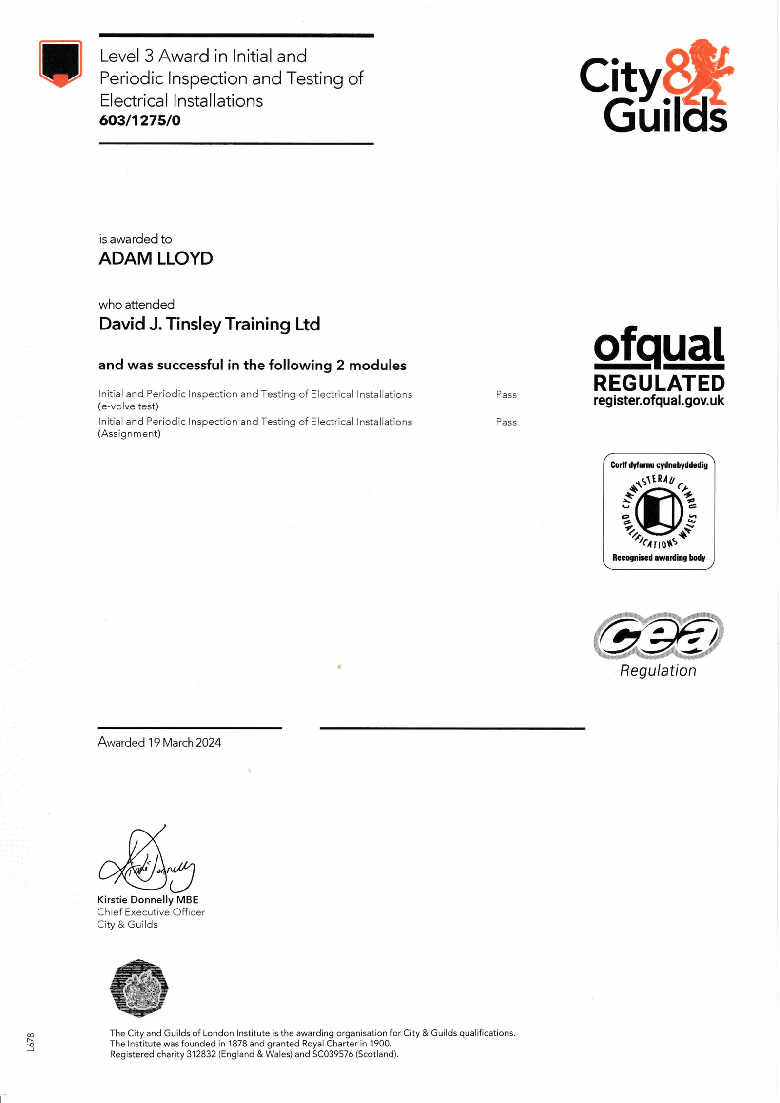 We are committed to compliance and safety across all work. [NAPIT, Part P, City & Guilds etc.]